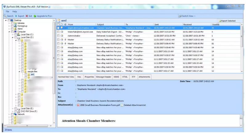Ouvrez le convertisseur de courrier électronique et le dossier contenant vos fichiers EML. Pour prévisualiser un des messages, cliquez dessus. Le contenu apparaîtra dans le panneau de droite.