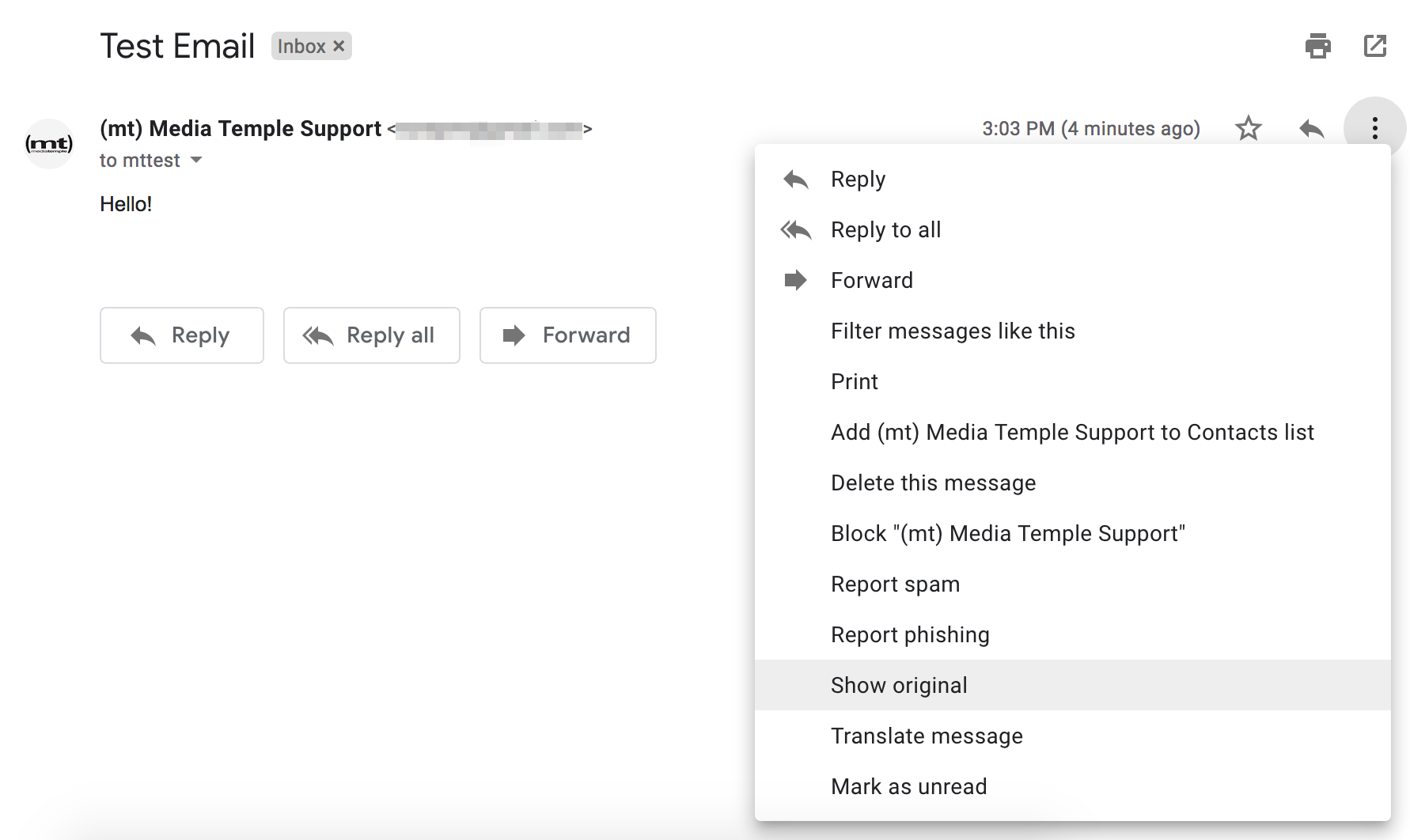 3. Scegli l'opzione "Mostra originale". Il messaggio verrà aperto in una nuova finestra.