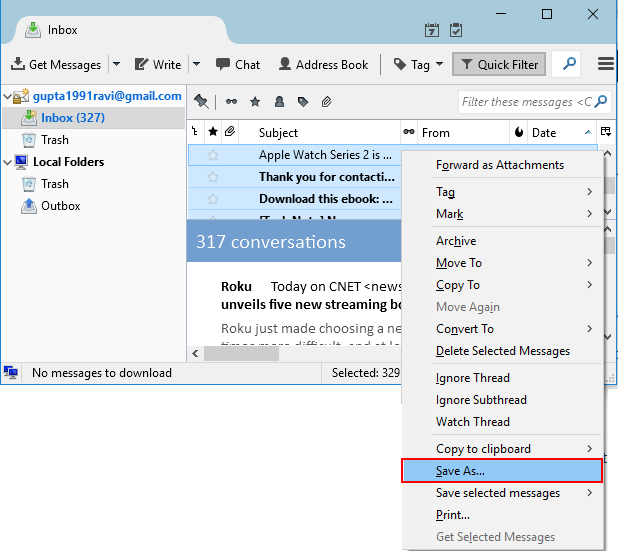 - Apri Thunderbird e seleziona le email che desideri salvare. Per evidenziare il contenuto di un'intera cartella, usa la combinazione Ctrl + A.